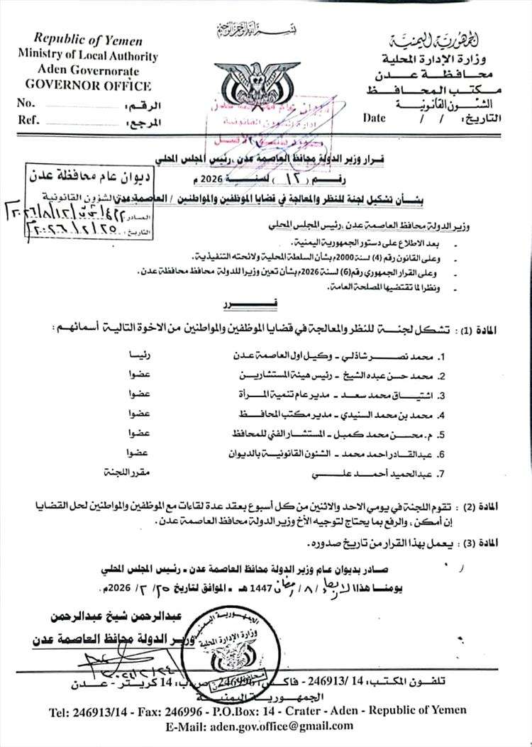 ونص القرار على تشكيل لجنة برئاسة وكيل أول المحافظة، وعضوية عدد من المسؤولين المختصين في الجوانب الإدارية والقانونية والمالية، على أن تتولى اللجنة استقبال قضايا الموظفين والمواطنين ودراستها والعمل على إيجاد المعالجات المناسبة وفقًا للقوانين واللوائح النافذة.