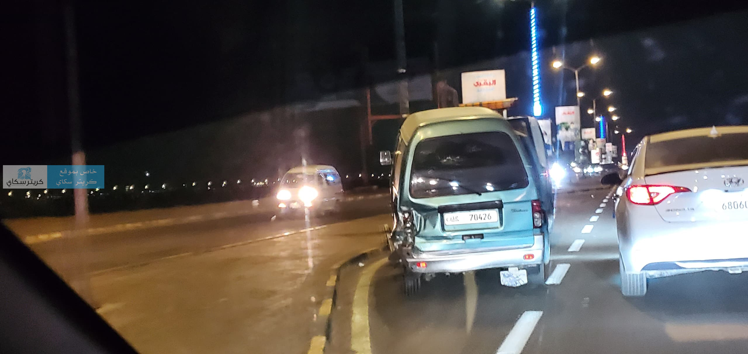 وتعرض باص دباب لحادث مروري بالطريق البحري قبل ان يتم سحبه بالونش