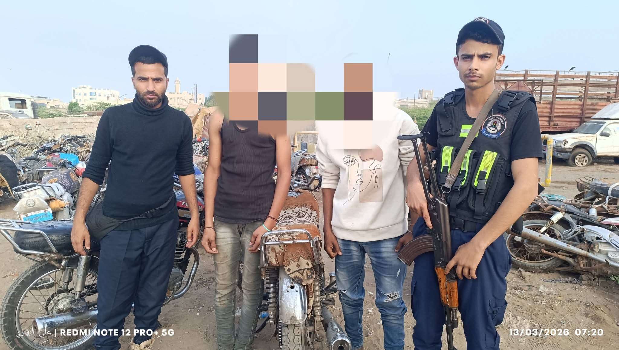 تمكنت وحدة المرور السري بمحافظة الحديدة اليوم الجمعة 13 مارس 2026م، من ضبط ثلاث دراجات نارية يقوم سائقوها بأعمال الاستعراض والترفيع وإصدار أصوات مزعجة في شوارع المدينة، إضافة إلى ضبط شخصين مرافقين لهم.