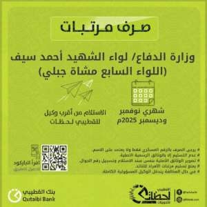 أعلن بنك القطيبي اليوم عن صرف مرتبات منتسبي وزارة الدفاع – اللواء الثاني دعم وإسناد لشهري نوفمبر ودي...