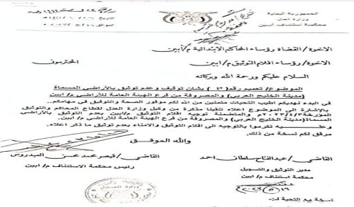 وأشار التحذير إلى أن القضية منظورة حالياً أمام نيابة الأموال الثانية لمكافحة الفساد، والهيئة الوطنية العليا لمكافحة الفساد، إضافة إلى توجيهات المحامي العام الأول لرئيس نيابة الاستئناف في محافظة أبين الصادرة بتاريخ 9 يوليو 2023 للتحقيق في الخروقات والتصرفات غير القانونية.