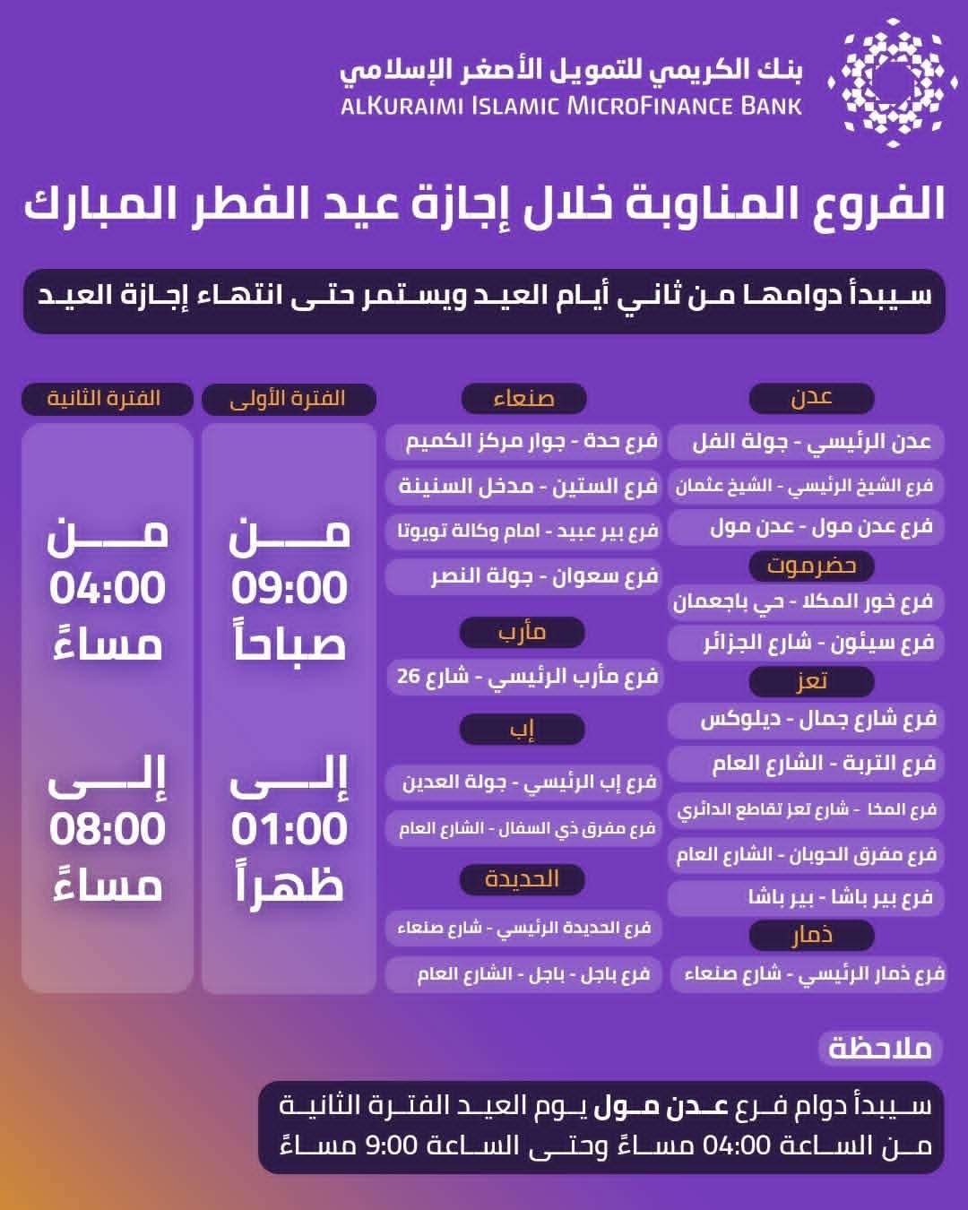 وأوضح البنك أن الفروع ستعمل على فترتين يوميًا من 9 صباحًا حتى 1 ظهرًا، ومن 4 عصرًا حتى 8 مساءً، وتشمل عدة مدن رئيسية بينها عدن وصنعاء وتعز وحضرموت، مع مواعيد خاصة لبعض الفروع، أبرزها فرع عدن مول الذي سيعمل مساءً يوم العيد حتى الساعة 9 ليلًا، مؤكدًا التزامه بخدمة عملائه خلال المواسم والإجازات.