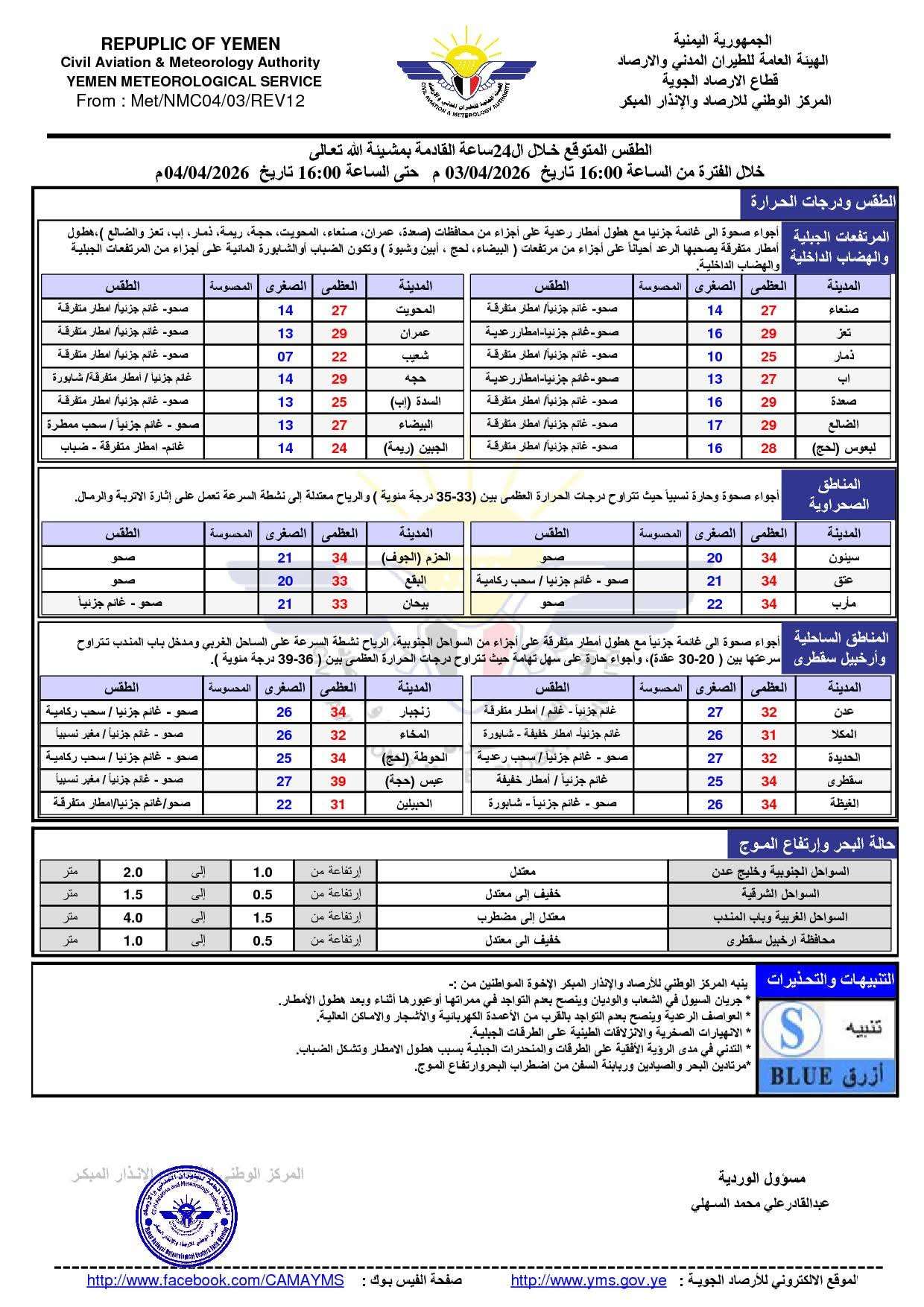 توقّع المركز الوطني للأرصاد والإنذار المبكر، حالة من التقلبات الجوية في عدد من مناطق اليمن خلال الـ24 ساعة القادمة، بدءًا من الساعة 16:00 من يوم 3 أبريل 2026م وحتى الساعة 16:00 من يوم 4 أبريل 2026م.