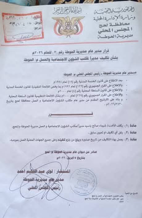 أصدر مدير عام مديرية الحوطة بمحافظة لحج القرار رقم(2) للعام 2026م