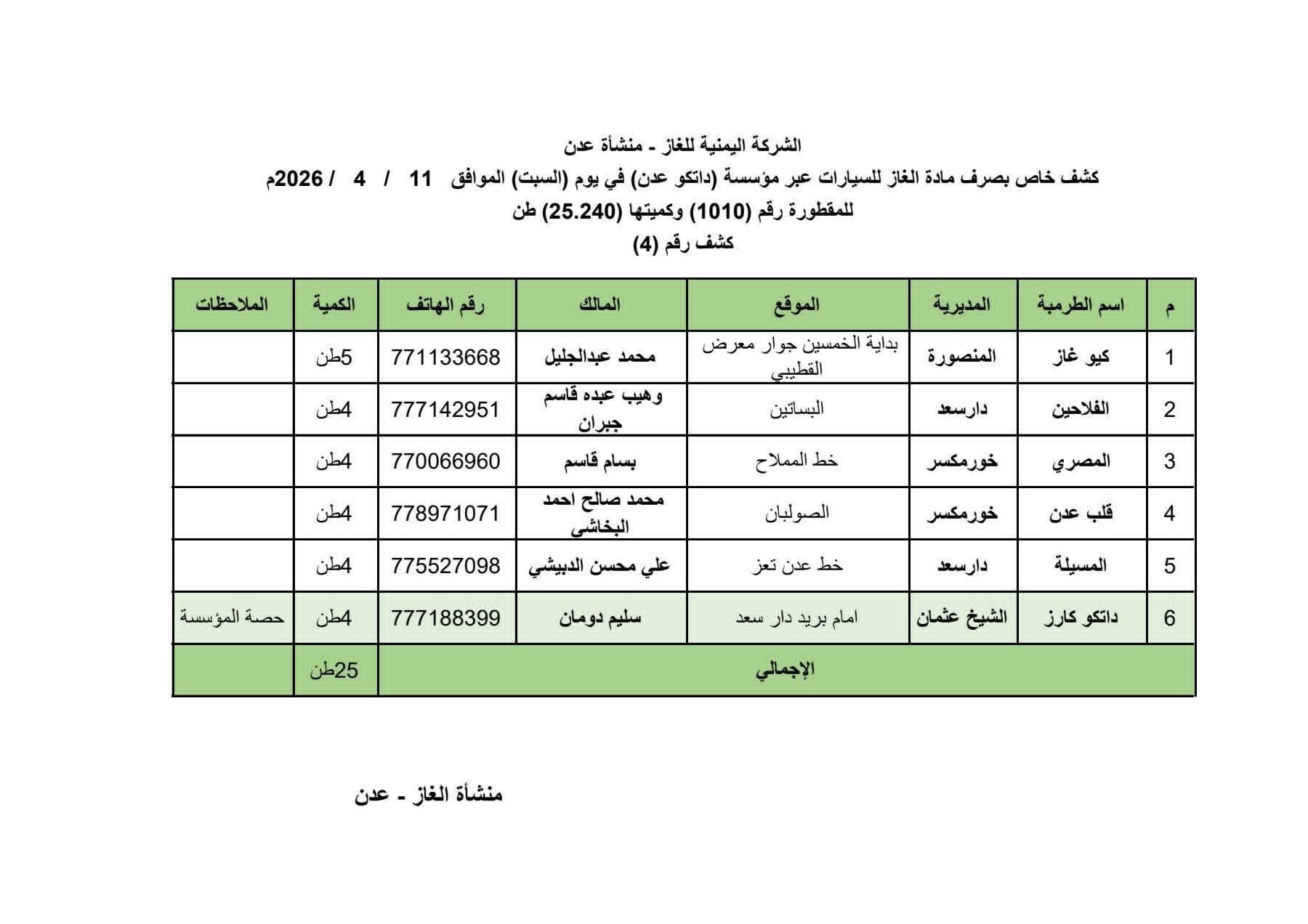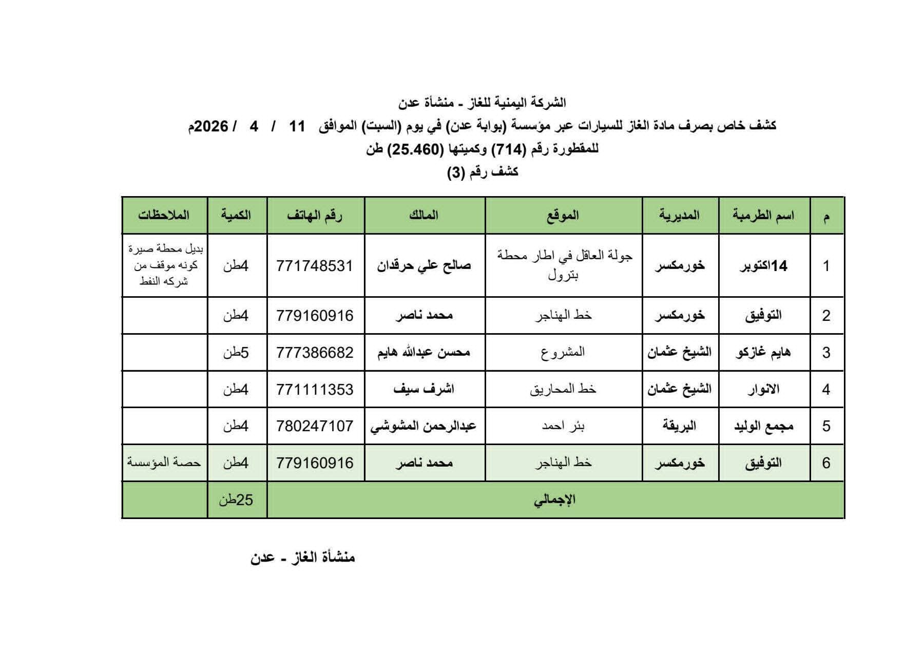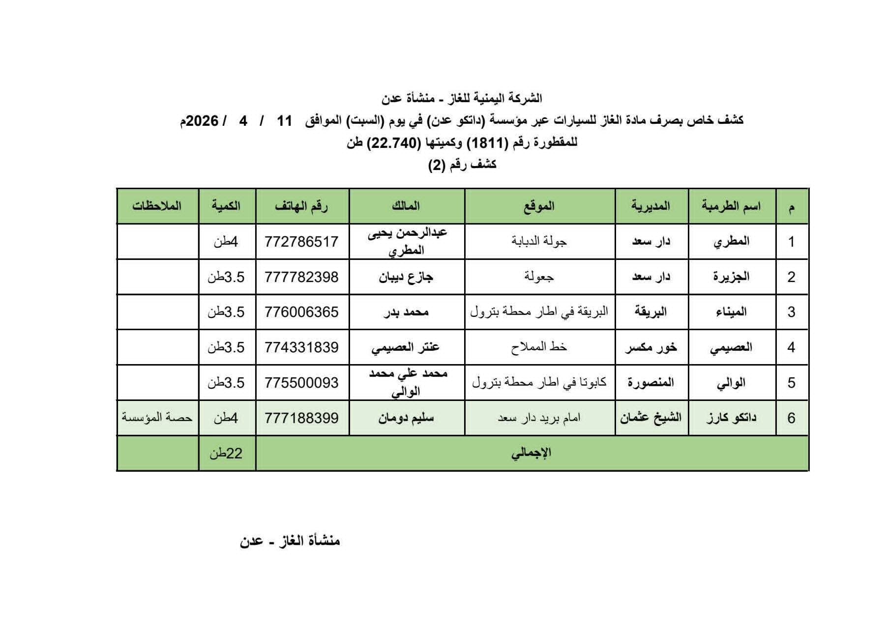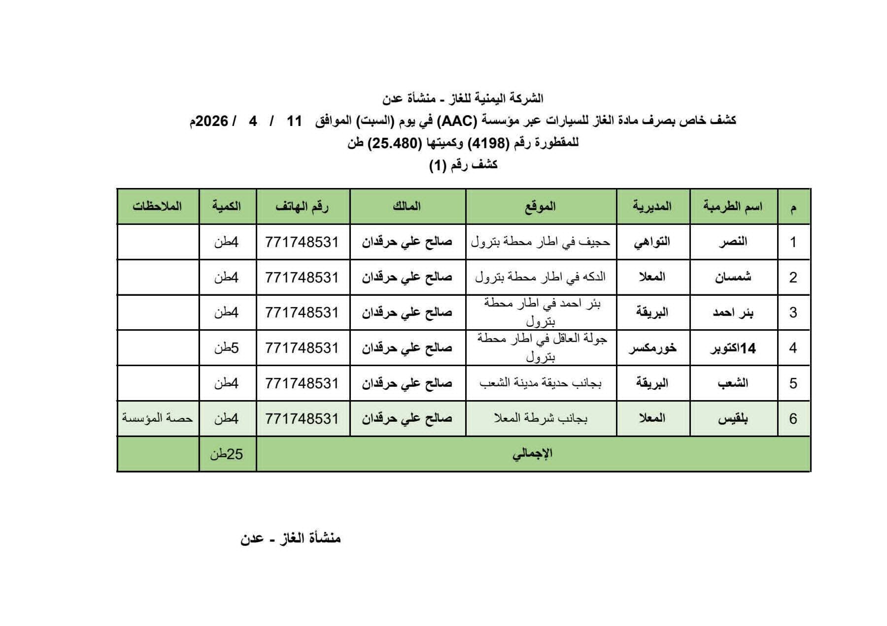 كشفت مصادر عن آلية توزيع الغاز على طرمبات السيارات في مديريات العاصمة عدن، حيث سيتم تعبئة المحطات يوم السبت، على أن تبدأ معظمها العمل مساءً، فيما تفتح أغلب المحطات صباح يوم الأحد الموافق 12 أبريل 2026.