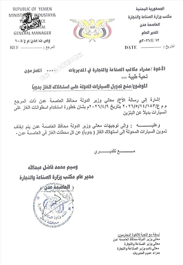 أصدرت قيادة مكتب وزارة الصناعة والتجارة في العاصمة المؤقتة عدن تعميمًا رسميًا يقضي بإيقاف تموين السيارات المحوّلة للعمل بالغاز (يدويًا) في جميع محطات الغاز داخل المحافظة، وذلك استنادًا إلى توجيهات عليا تهدف إلى الحد من المخاطر المرتبطة باستخدام هذه الأنظمة.