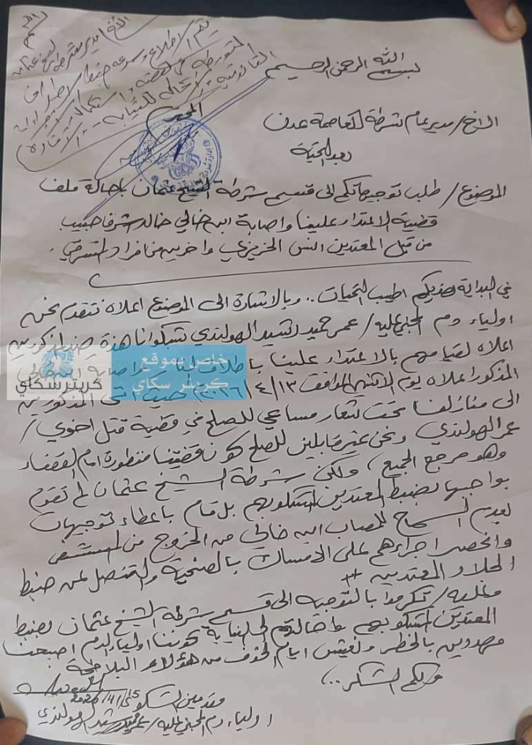 عاجل:اسرة شاب تعرض لمحاولة اغتيال:شرطة الشيخ عثمان اختطفت ولدنا دون امر من النيابة وندعو النائب العام للتدخل