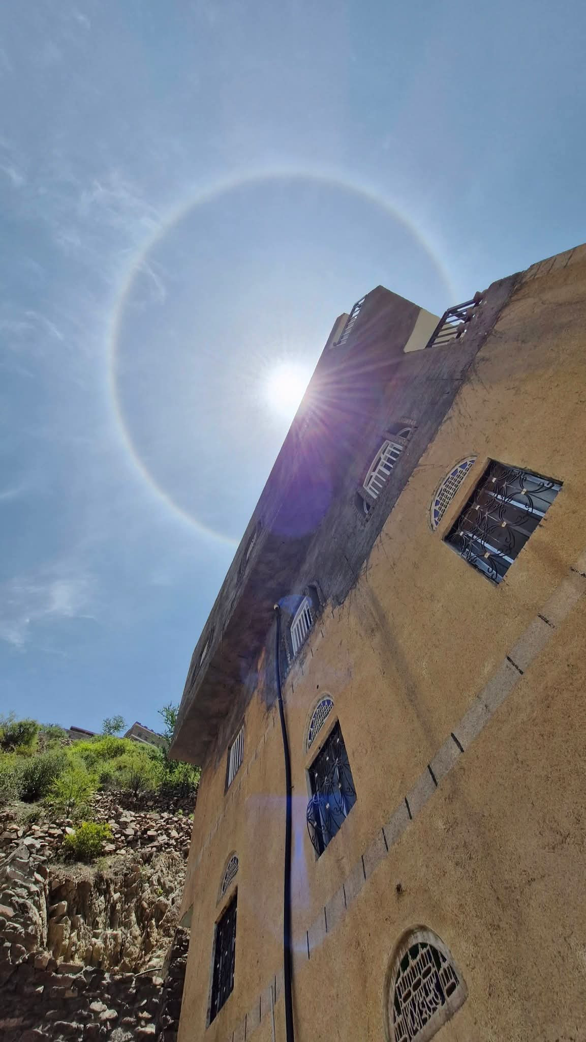 شهدت سماء منطقة القود لعصار في يافع، ظهر اليوم، ظاهرة جوية لافتة تمثلت في ظهور هالة دائرية تحيط بالشمس، ما أثار دهشة وإعجاب المواطنين.
