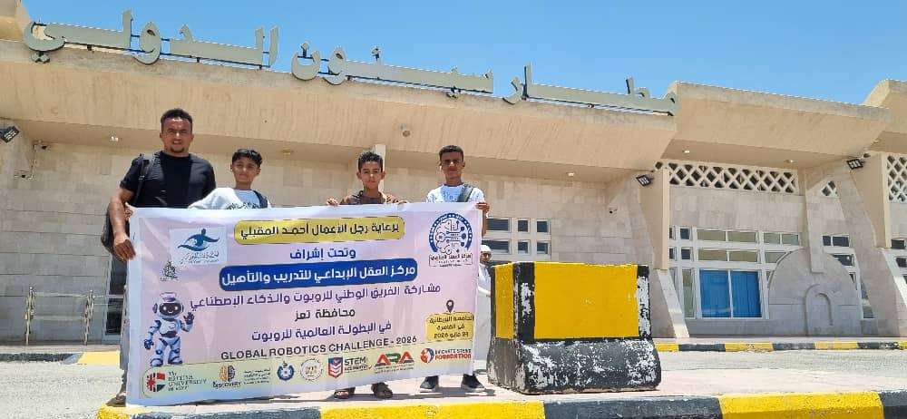 بخطوات واثقة وطموحات تعانق السحاب، وصل فريق محافظة تعز للروبوت والذكاء الاصطناعي إلى مطار سيئون الدولي، استعداداً للإقلاع يوم غدٍ الخميس صوب العاصمة المصرية القاهرة. وتأتي هذه الرحلة لتمثيل اليمن في المحفل العلمي العالمي الأبرز، "البطولة العالمية للروبوت GRC 2026"، التي تستضيفها الجامعة البريطانية بمشاركة دولية واسعة.