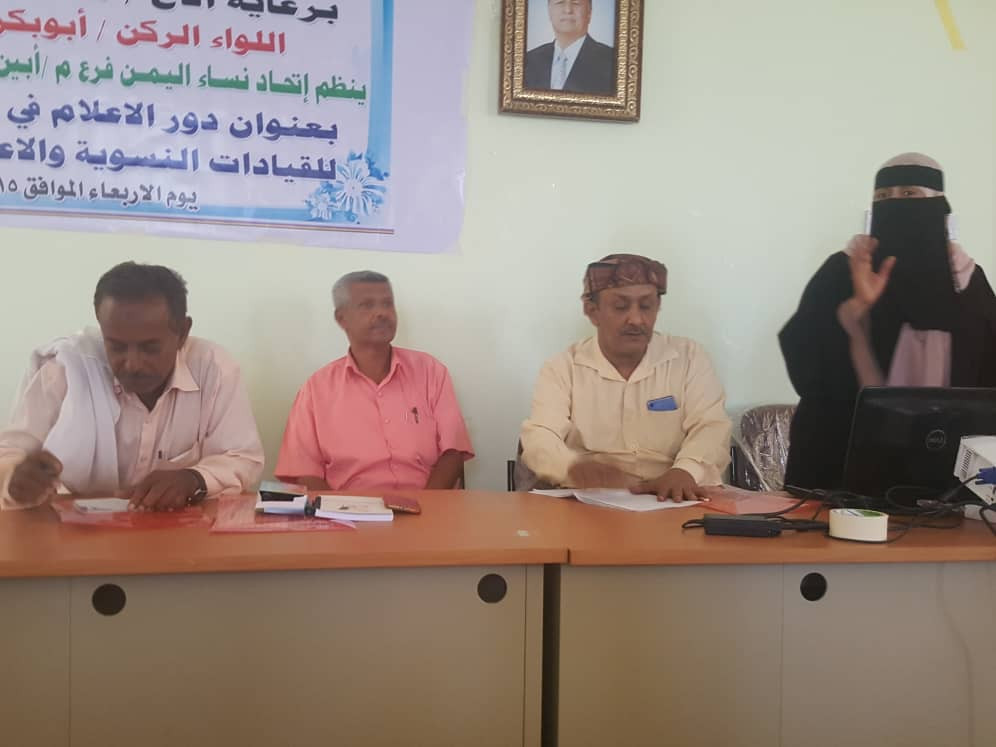 برعاية محافظ محافظة أبين اللواء الركن أبوبكر حسين سالم نظم إتحاد نساء اليمن فرع محافظة أبين ومكتب الإعلام في المحافظة صباح اليوم الأربعاء 15مايو 2019م في زنجبار ورشة عمل بعنوان دور الإعلام في دعم قضايا المرأه للقيادات النسوية والإعلاميين في محافظة أبين الأستاذة عديله أحمد خضر الأمين العام لإتحاد نساء اليمن أبين والأستاذ نائف زين نائب مدير عام مكتب الإعلام في محافظة أبين وعددا من القيادات النسوية وعضوات الإتحاد أبين وعدداً من الإعلاميين.