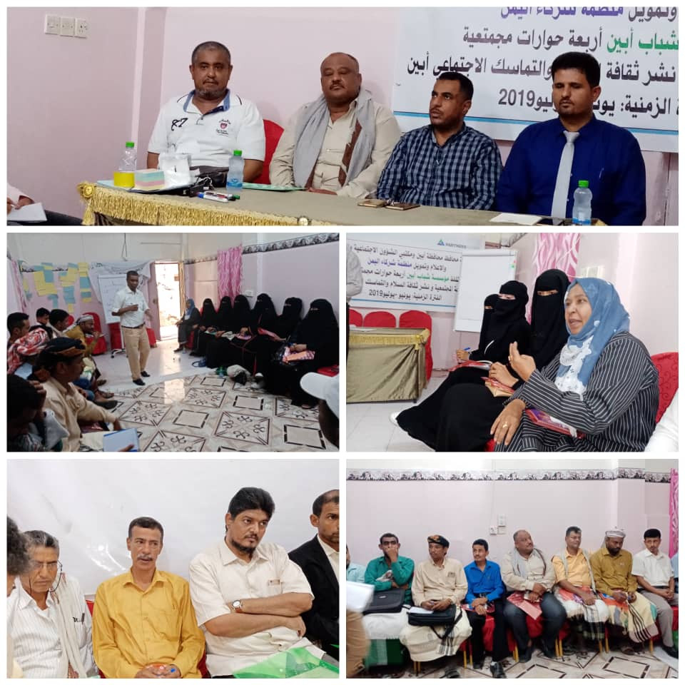 برعاية محافظ محافظة أبين و مكتبي الشؤون الإجتماعية والعمل والإعلام أبين وتمويل منظمة شركاء اليمن وبحضور الأستاذ محمود حمزه وكيل محافظة أبين َالدكتور ياسر باعزب مدير عام إعلام أبين والشيخ ناصر المنصري مدير عام مديرية خنفر والأستاذ حمدي سالم منصور مدير عام التدريب والتأهيل في وزارة الخدمة المدنية ورئيس مؤسسة شباب أبين دشنت مؤسسة شباب أبين المؤسسة الرائدة في محافظة أبين صباح يوم أمس الخميس 27يونيو 2019م في مقر المؤسسة بمدينة جعار الحلقات النقاشية الحوارية حول ثقافة السلام والتماسك الإجتماعي.