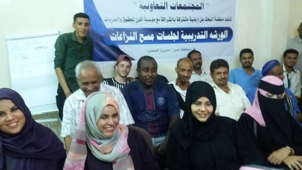 اختتمت مؤسسة أكون للحقوق والحريات بعدن، الورشة التدريبية الخاصة بالوسطاء من السلطة المحلية لمسح النزاعات بمديرية المنصورة محافظة عدن، والذي نفذتها منظمة البحث عن أرضية مشتركة، والتي استمرت على مدى خمسة أيام.