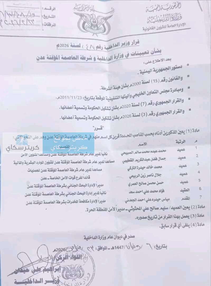 تضمن القرار تعيين عدد من القيادات الأمنية في مناصب رفيعة بشرطة محافظة عدن، وهم: