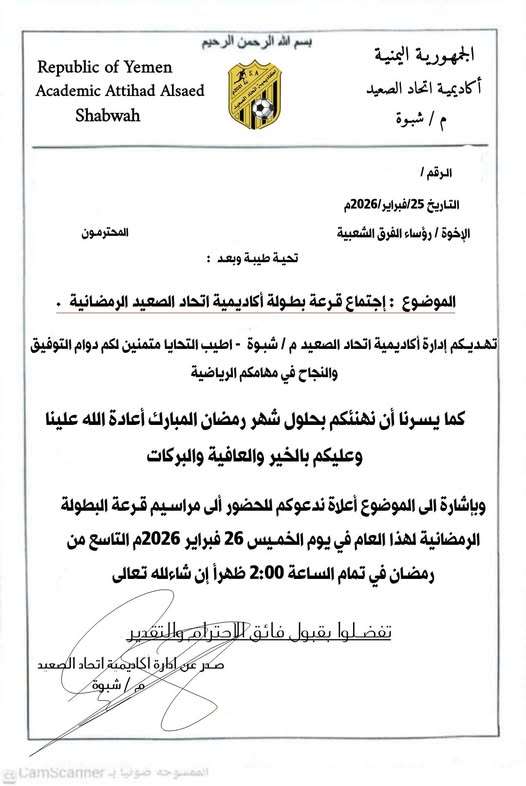 أعلنت إدارة أكاديمية اتحاد الصعيد لكرة القدم بمحافظة شبوة، عن استكمال ترتيباتها لإقامة مراسم قرعة البطولة الرمضانية الكبرى للعام 2026م، وسط أجواء من الترقب الرياضي في المديرية.