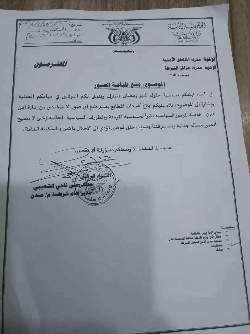 أصدرت إدارة أمن العاصمة المؤقتة عدن تعميماً أمنياً صارماً قضى بمنع طباعة الصور والمواد الدعائية بجميع أشكالها، إلا بعد الحصول على تصريح رسمي مسبق من الجهات المختصة، وذلك ضمن حزمة إجراءات تهدف لتعزيز الاستقرار في المدينة.