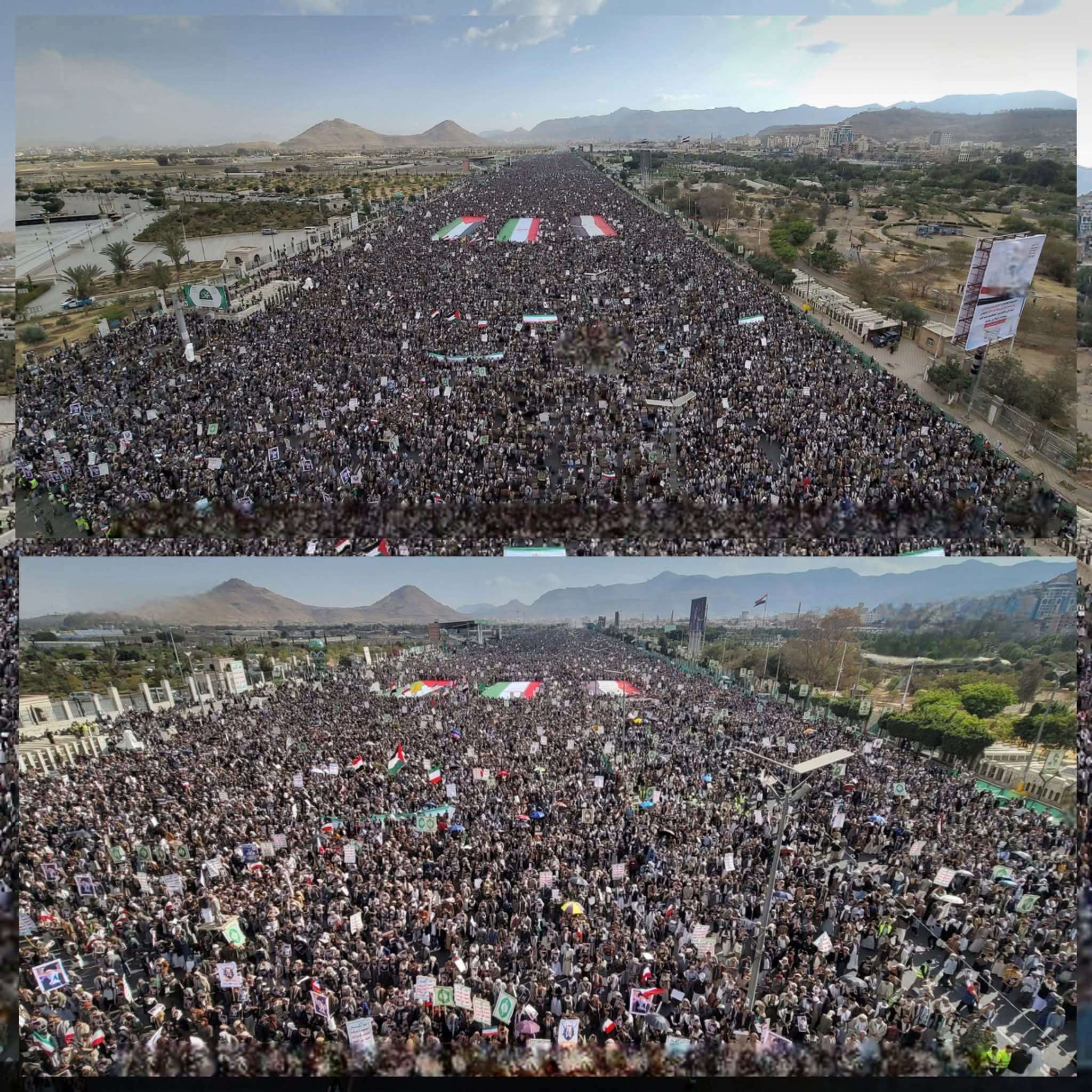 وتظاهر عشرات الالاف تلبية لدعوة زعيم الحوثيين للتضامن مع ايران.