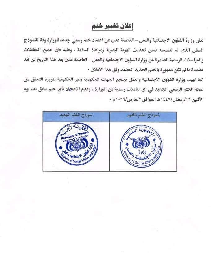 تُعلن وزارة الشؤون الاجتماعية والعمل في العاصمة عدن عن اعتماد ختم رسمي جديد للوزارة، وذلك في إطار تحديث الهوية البصرية للوزارة ومراعاة معايير السلامة العامة.
