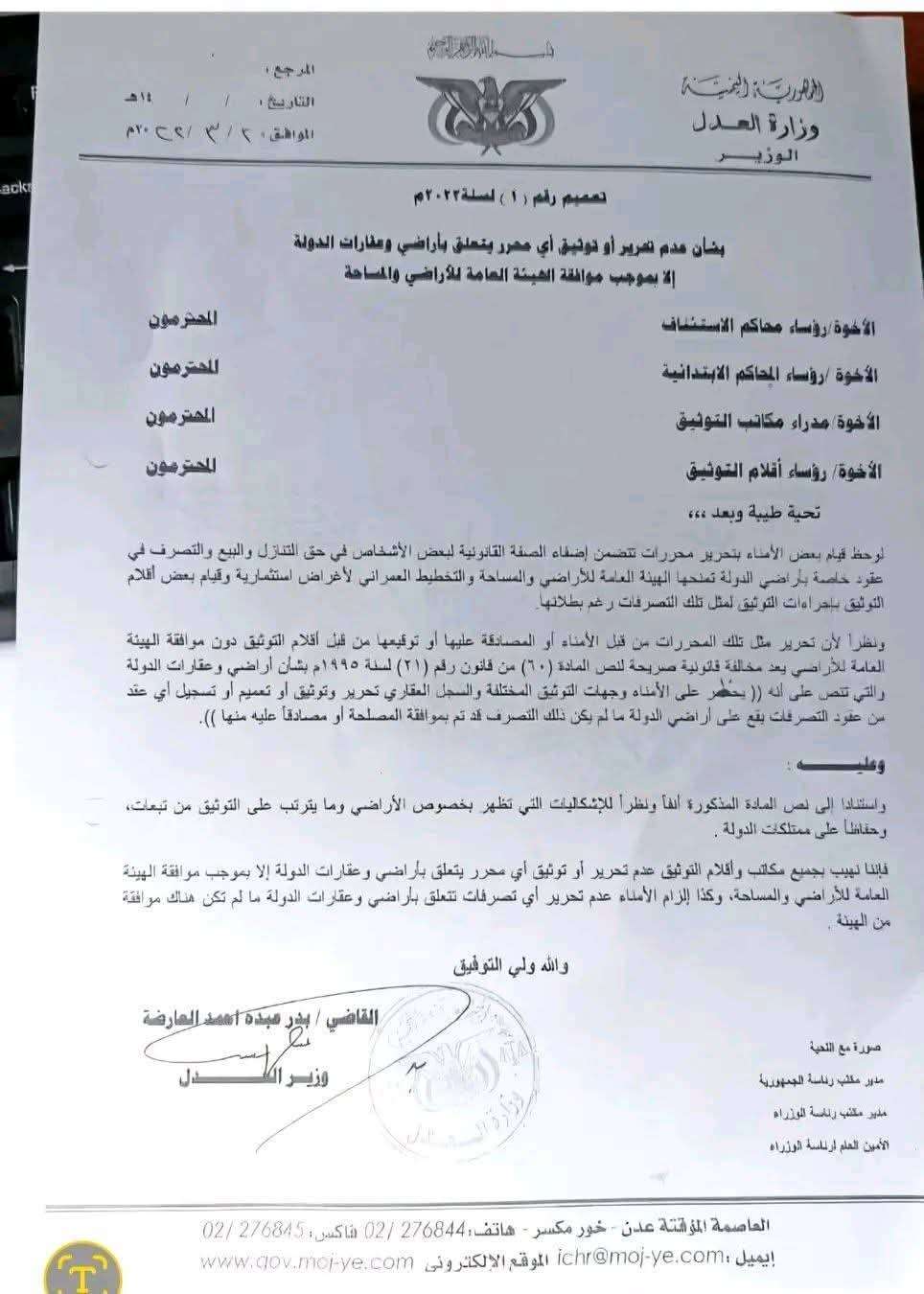 أصدر معالي وزير العدل، القاضي بدر عبده أحمد العارضة، تعميماً قضائياً هاما (رقم 1 لعام 2022م) موجهًا إلى رؤساء محاكم الاستئناف والابتدائية ومدراء مكاتب وأقلام التوثيق.