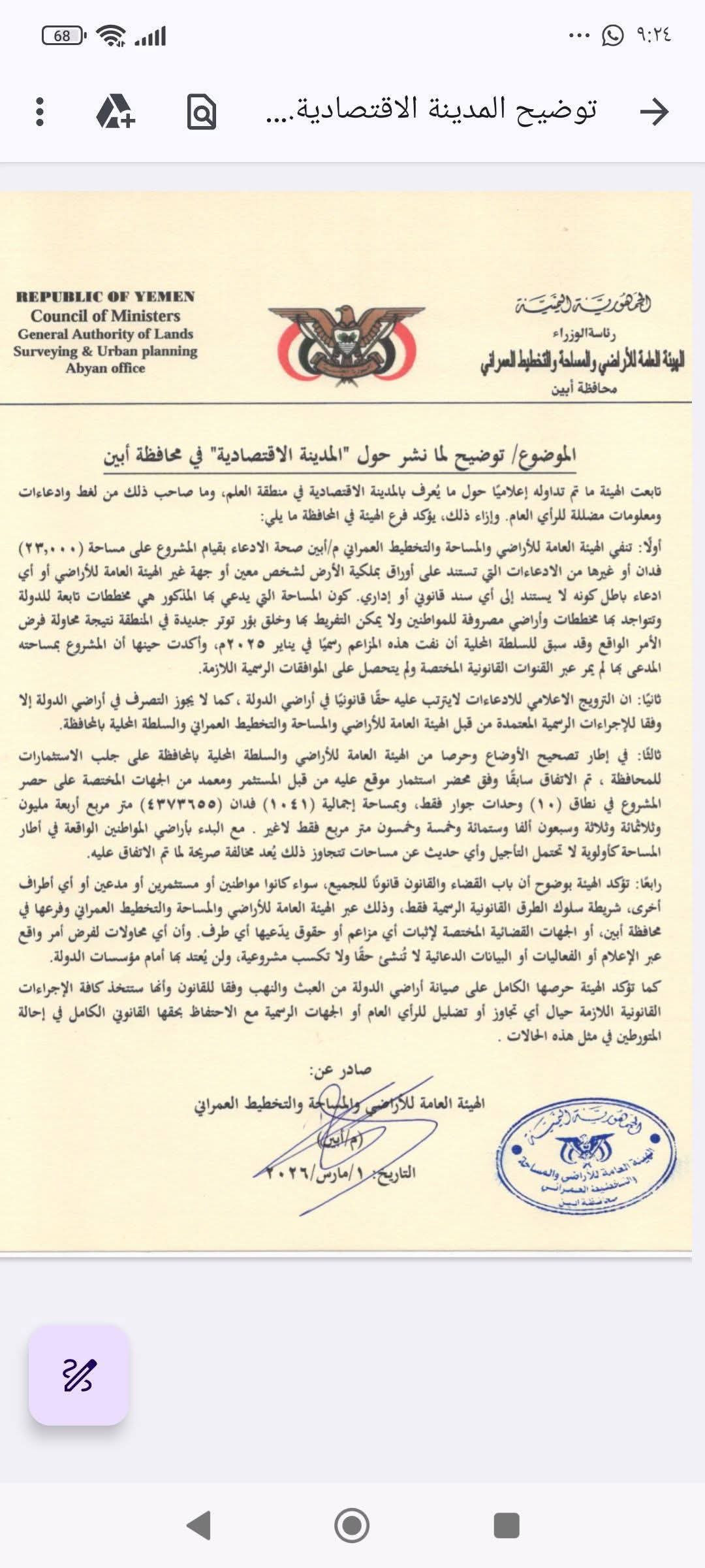 وفي سياق متصل، أصدر فرع الهيئة العامة للأراضي بمحافظة أبين بياناً توضيحياً فند فيه ما يتم تداوله حول ما يسمى بـ "المدينة الاقتصادية" في منطقة العلم.