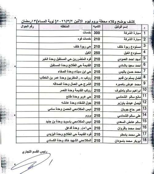 أعلنت إدارة محطة بروم للغاز المنزلي عن كشف توزيع الحصص المعتمدة لوكلاء المحطة ليومنا هذا الإثنين 2 مارس 2026م (الموافق 13 رمضان)، وذلك ضمن "نوبة المساء" لضمان تغطية احتياجات المواطنين في مختلف أحياء ومديريات ساحل حضرموت.