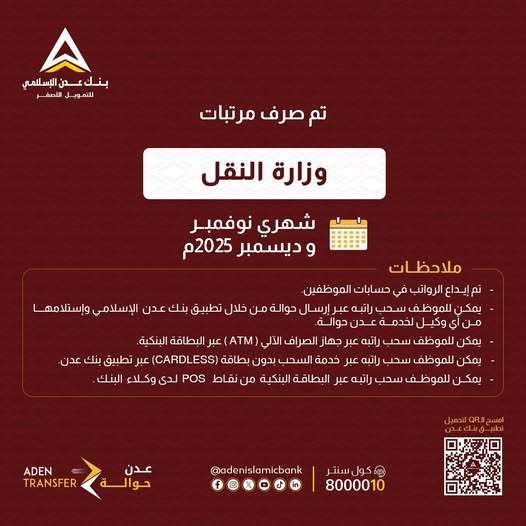 أُعلنت عملية صرف مرتبات موظفي وزارة النقل لشهري نوفمبر وديسمبر 2025، حيث تم إيداع الرواتب في حسابات الموظفين لدى بنك عدن.
