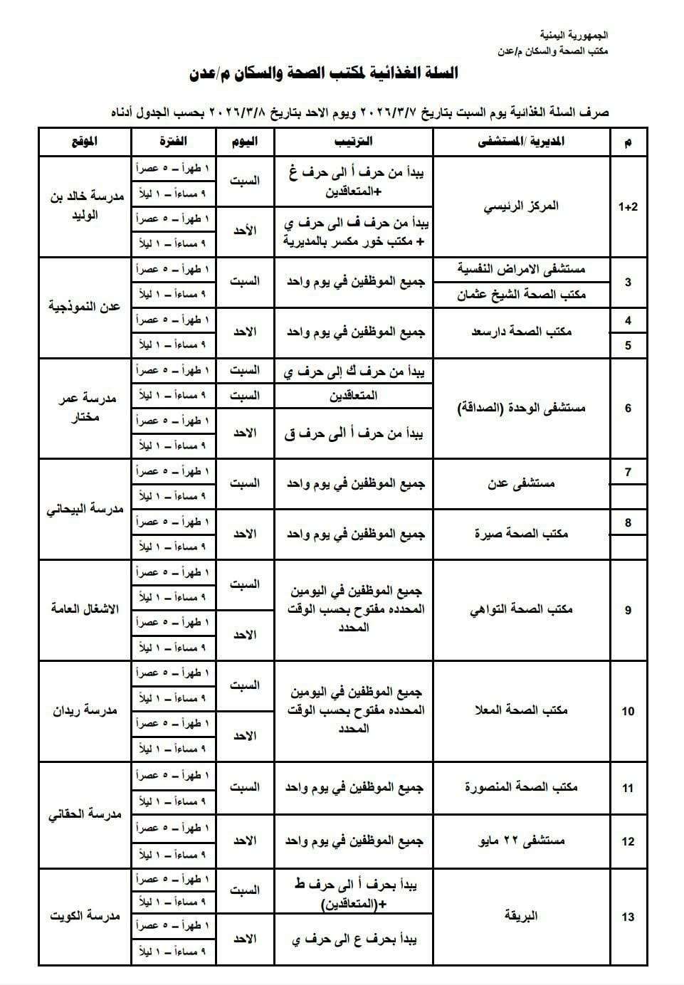 أعلن مكتب الصحة العامة والسكان بعدن عن بدء توزيع السلة الغذائية لكوادره الصحية في العاصمة المؤقتة عدن وفروع المكاتب التابعة له في المديريات، إضافة إلى عدد من المستشفيات الحكومية، وذلك يومي السبت والأحد الموافقين 7 و8 مارس.