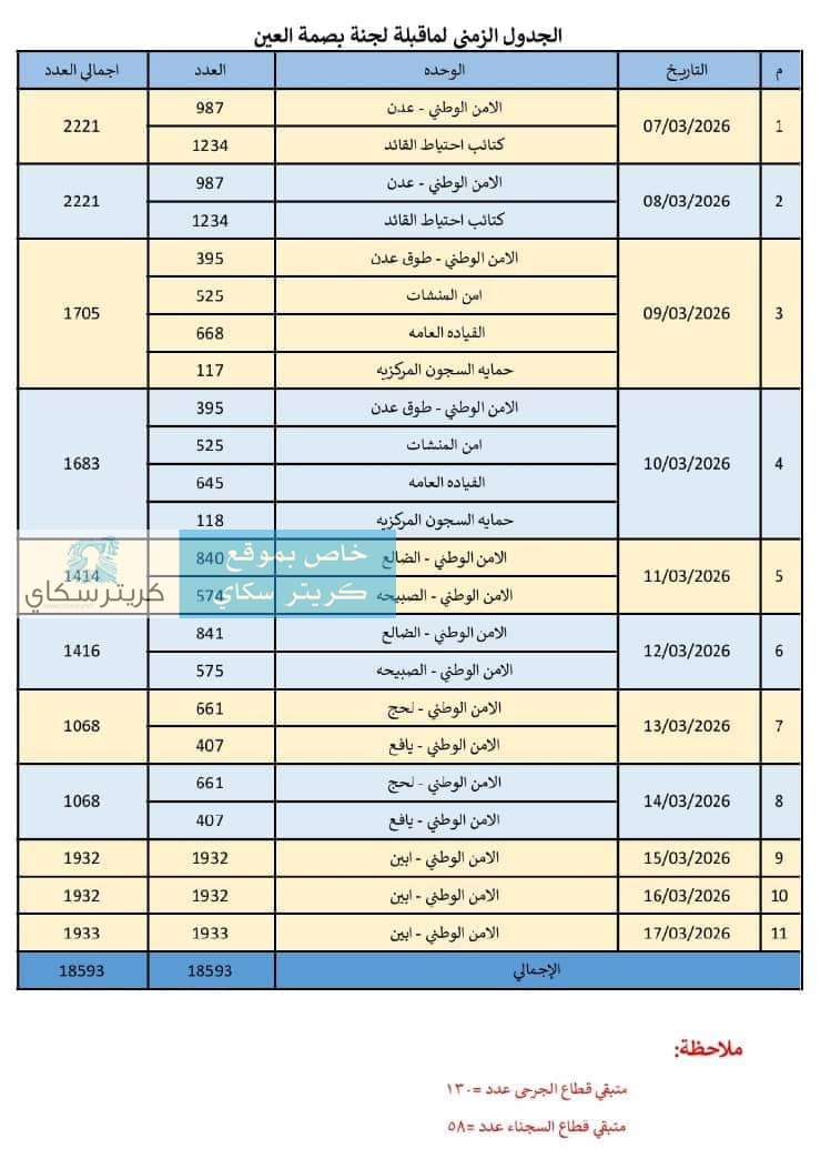 ​وفي سياق متصل، كشف الجدول الزمني الصادر عن "لجنة مقابلة بصمة العين" عن بدء ومواصلة إجراءات الحصر الرقمي لمختلف الوحدات الأمنية للفترة من 7 مارس وحتى 17 مارس 2026م. وتشمل الخطة الوحدات التالية وفقاً للجدول الزمني: