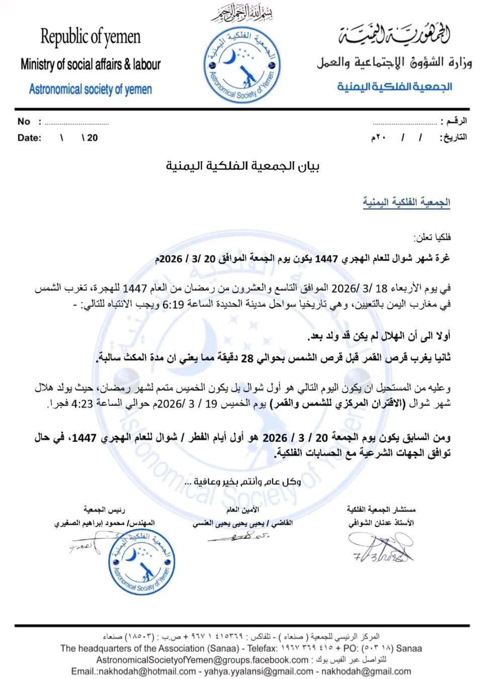 أعلنت الجمعية الفلكية اليمنية أن يوم الجمعة 20 مارس 2026 سيكون فلكيًا غرة شهر شوال لعام 1447هـ وأول أيام عيد الفطر المبارك، في حال توافق الحسابات الفلكية مع الرؤية الشرعية التي تعلنها الجهات المختصة.