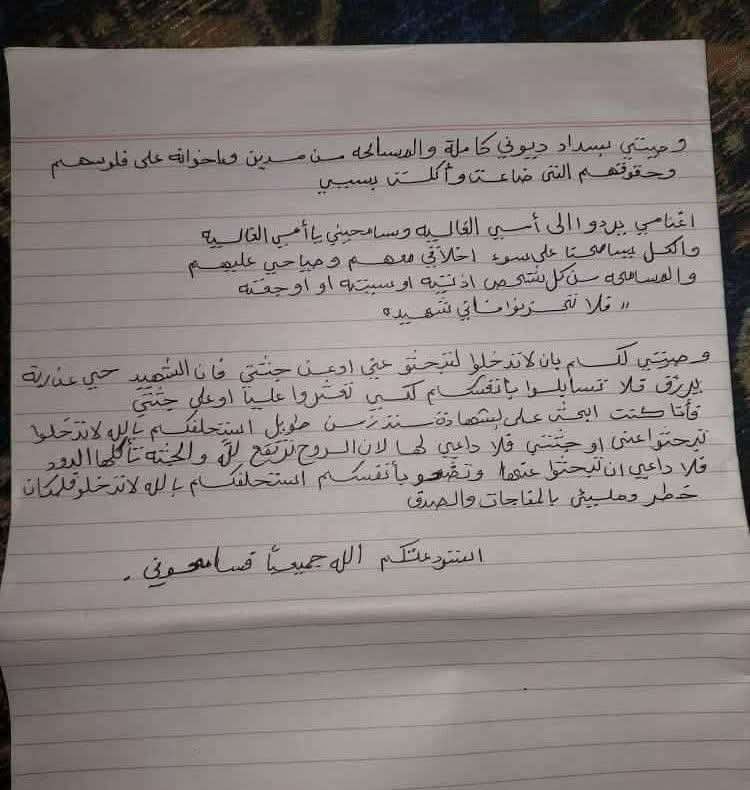 تداول ناشطون على مواقع التواصل الاجتماعي وصية مؤثرة لأحد شهداء تعز، أوصى فيها أسرته والمقربين منه بسداد ديونه كاملة ورد الحقوق إلى أصحابها، طالباً المسامحة من كل من أساء إليه أو أخطأ بحقه.