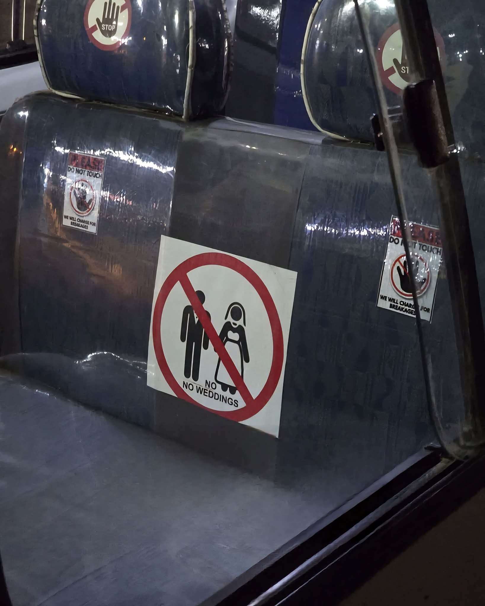 تداول ناشطون على مواقع التواصل الاجتماعي صورة لباص نقل عام في العاصمة اليمنية صنعاء، يظهر بداخله ملصق تحذيري على الكراسي مكتوب باللغة الإنجليزية: “NO WEDDINGS”.