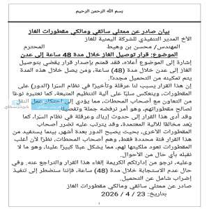 أصدر ممثلو سائقي ومالكي مقطورات الغاز بياناً عاجلاً موجهاً إلى المدير التنفيذي للشركة اليمنية للغاز...