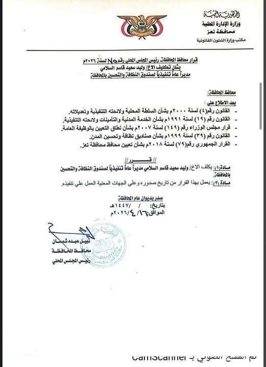 ويأتي هذا القرار في إطار التغييرات الإدارية الهادفة إلى تعزيز أداء المؤسسات الخدمية وتحسين مستوى النظافة والخدمات العامة في محافظة تعز.