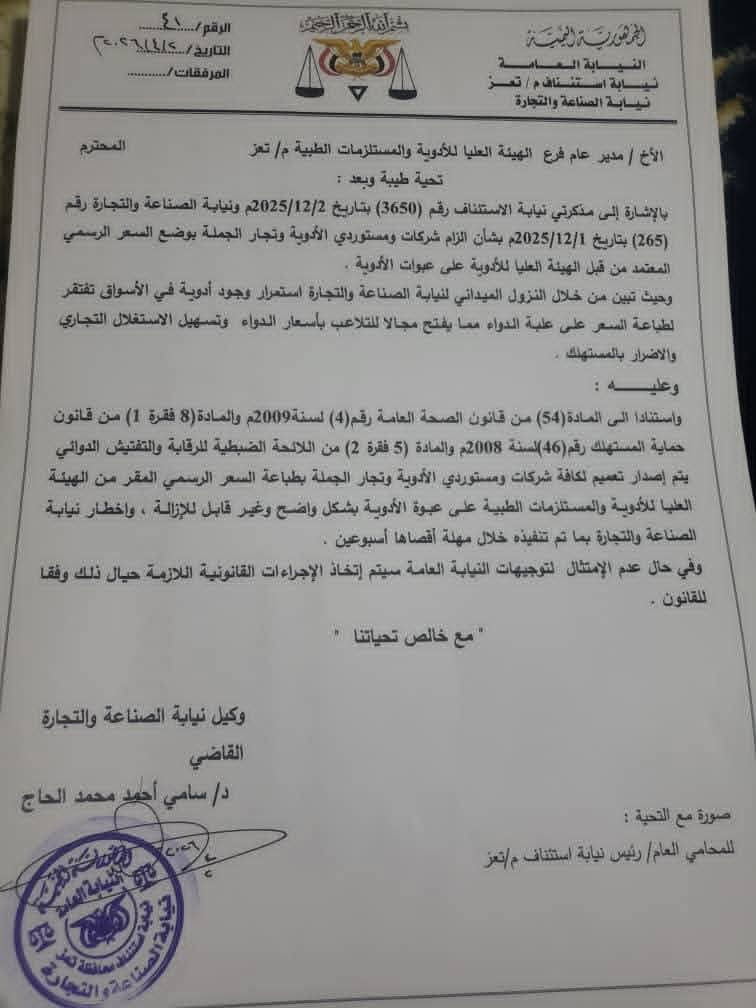 أصدرت النيابة العامة بمحافظة تعز توجيهات رسمية للهيئة العليا للأدوية والمستلزمات الطبية، حددت بموجبها مهلة أقصاها أسبوعان من تاريخ صدور التوجيه، للعمل على ضبط أسعار الدواء في السوق المحلية.