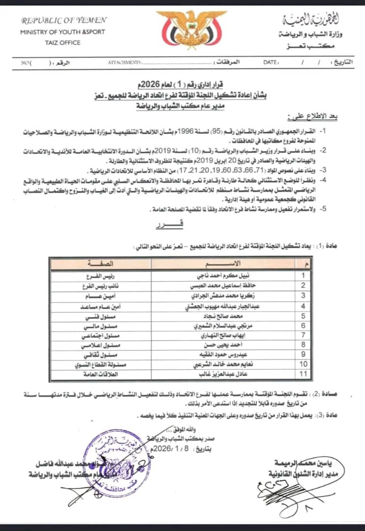 أصدر مكتب الشباب والرياضة بمحافظة تعز القرار رقم ١ لعام 2026م