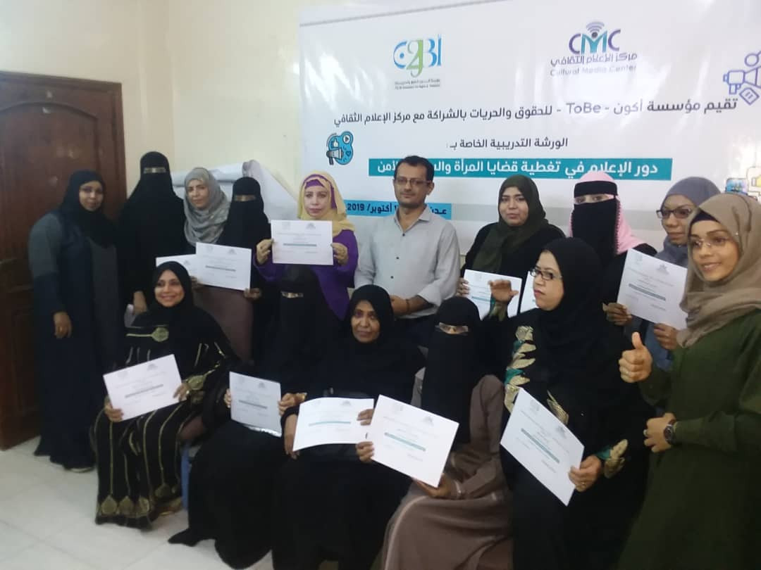اختتمت في العاصمة عدن، اليوم ورشة تدريبية حول دور الإعلام في تغطية "قضايا المرأة والسلام والأمن" والتي نظمتها مؤسسة أكون للحريات والحقوق وبالشراكة مع مركز الإعلام الثقافي " خلال الفترة التي استمرت (14-17) أكتوبر للعام 2019م، وبمشاركة عدد من الصحفيات والإعلاميات.