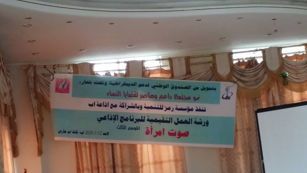 تحت شعار ( نحو مجتمع داعم ومناصر لقضايا النساء) و بتمويل من الصندوق الوطني لدعم الديمقراطية نفذت مؤسسة رمز للتنمية وبالشراكة مع إذاعة إب ورشة العمل التقييمية للبرنامج الإذاعي صوت إمرأة وللموسم الثالث على التوالي وبمشاركة أربعون مشارك ومشاركة من سلطة محلية ومجلس نواب ومحامين وحقوقيين وأكاديميين وإعلاميين وأوضح الأخ صلاح الحميري نائب مدير إذاعة إب منسق الورشة بأن الهدف العام من الورشة هو مناصرة قضايا المرأة والحفاظ على حقوقها ومشاركتها مع شقيقها الرجل في الواقع العمل وتقييم مخرجات البرنامج الإذاعي (صوت إمرأة ) والذي تم بثه عبر أثير إذاعة إب وقد اشتملت فعالية الورشة بالتعريف عن المؤسسة وأنشطتها ونبذة مختصرة عن برنامج صوت إمرأة والذي تعده وتقدمه الزميلة حنان العواضي وفيلم وثائقي عن مخرجات البرنامج ومشاركة المدرب الأستاذ عبدالله شريم كما أثريت الورشة بالعديد من النقاشات والآراء والتوصيات من قبل المشاركين والمشاركات.