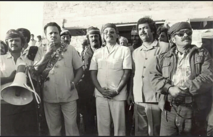 ويظهر في الصورة الى جانب الرئيس ناصر: أحمد مساعد حسين، عبد القادر باجمال، عبدالله ناصر رشيد وأحمد محمد الجبواني..