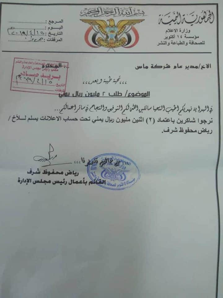 واضاف نشطاء محليين: وصلت الينا وثيقة تظهر الفساد الكبير والمستشري في مؤسسة ١٤ اكتوبر من خلال مذكرة وجهها القائم بالاعمال الى شركة ماس بتاريخ ٥ أبريل ٢٠١٩م يوجههم فيها الى اعتماد مبلغ اثنين مليون ريال الى حسابه الخاص مقابل الاعلانات ضارباً القوانين واللوائح بعرض الحائط .