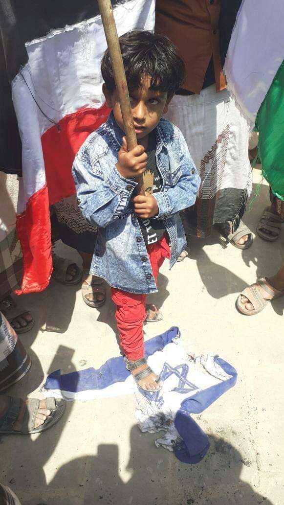 وتداول ناشطون وسياسيون صورة لطفل متظاهر يُحمل علم الجمهورية اليمنية ويدوس على علم إسرائيل في المليونية التي نظمها الائتلاف الوطني الجنوبي في عتق.