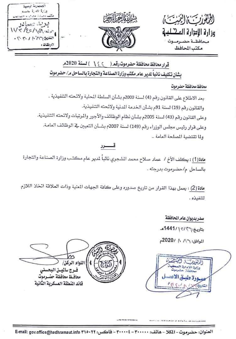 أصدر محافظ محافظة حضرموت اللواء الركن فرج البحسني قرارا بتعيين الأخ عماد صلاح نائبا لمدير عام مكتب الصناعة والتجارة بساحل حضرموت.