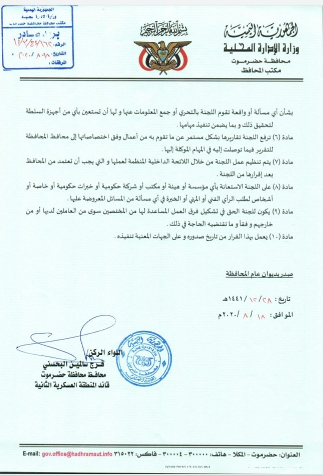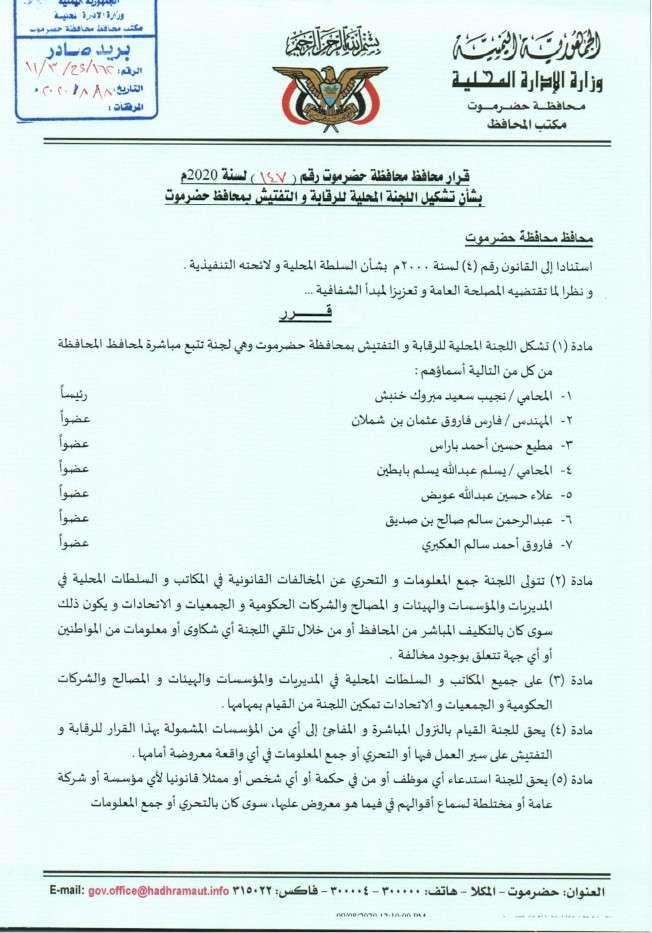 أصدر محافظ محافظة حضرموت اللواء الركن فرج البحسني قرارا بشأن تشكيل اللجنة المحلية للرقابة والتفتيش في المحافظة.