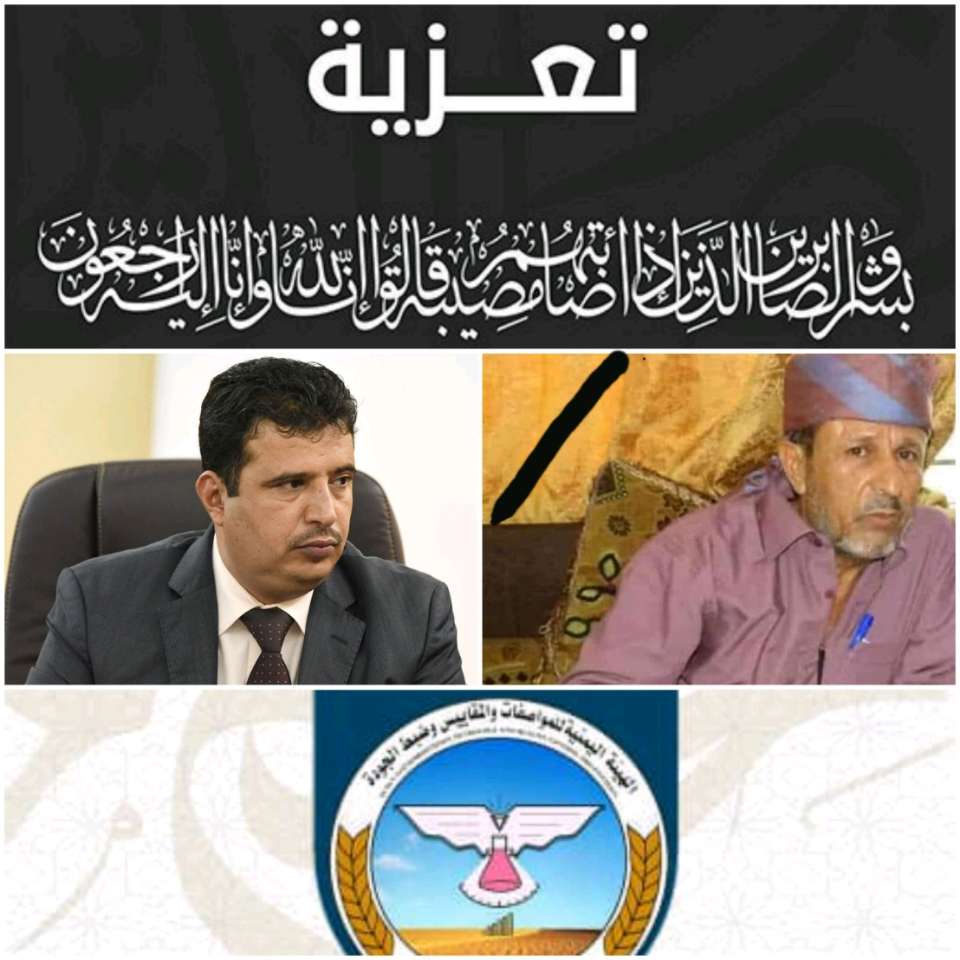 تقدم كافة موظفي ومنتسبي الهيئة اليمنية للمواصفات والمقاييس وضبط الجودة بالعزاء والمواساة للمهندس / حديد مثنى الماس – مدير عام الهيئة