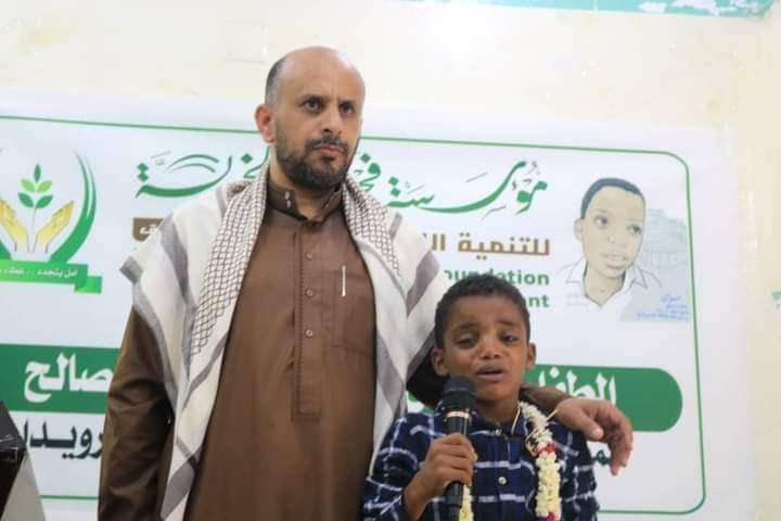 و أقدمت المؤسسة بتكريم الطفل بشهادة تكريمة ومبلغ مالي في حفل بسيط تخلله مكالمة هاتفية من الشيخ حمود المخلافي الذي قدم مبلغ نصف مليون ريال لأسرة الطفل ..
