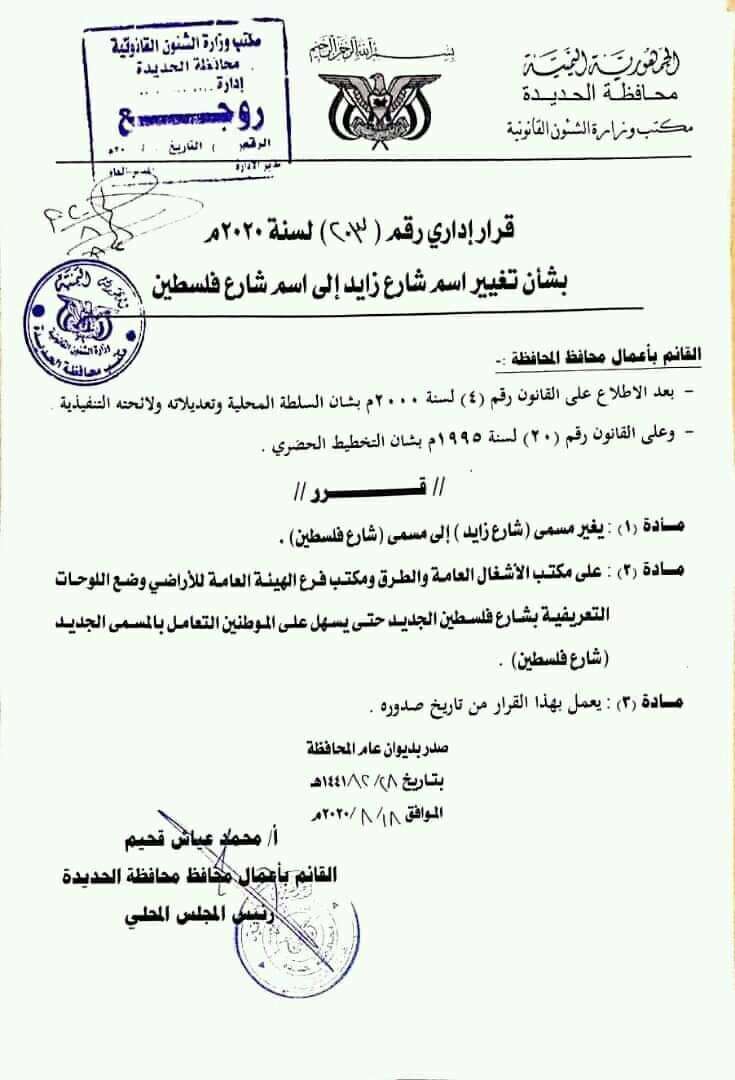 أصدر القائم بأعمال محافظ محافظة الحديدة محمد عياش قرار يقضي بتغيير شارع زايد إلى شارع فلسطين بعد قيام دولة الإمارات بالتطبيع مع الإحتلال...