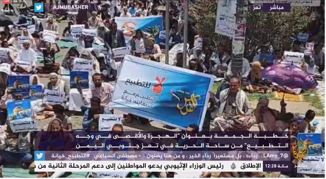 تشهد مدينة تعز في هذه الأثناء مظاهرات ومسيرات خرجت من مساجد المدينة رفضاً للتطبيع مع الإحتلال الإسرائيلي..