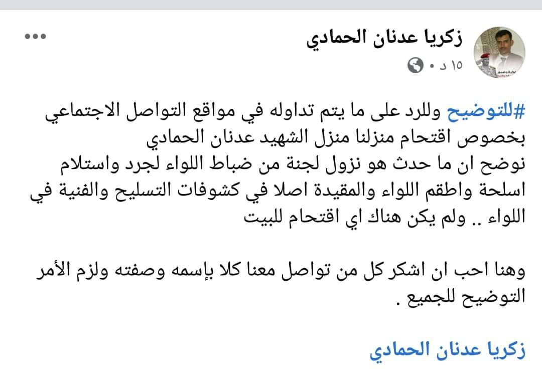 كشف نجل العميد الشهيد عدنان الحمادي حقيقة اقتحام منزل والده.