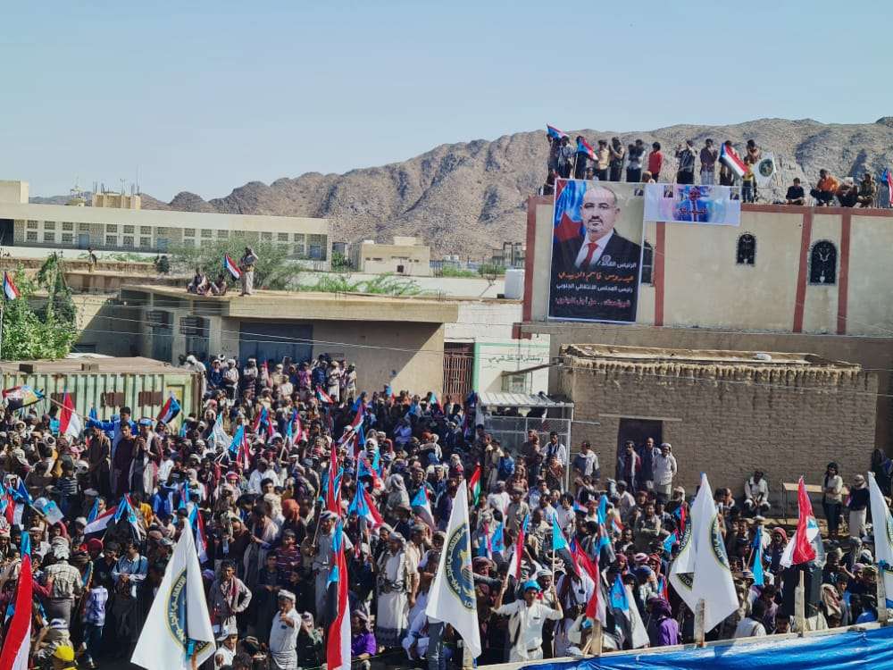 و احتشد الالاف من المتظاهرين في مهرجان للمجلس الانتقالي بمدينة المصينعة بشبوة صباح الخميس.