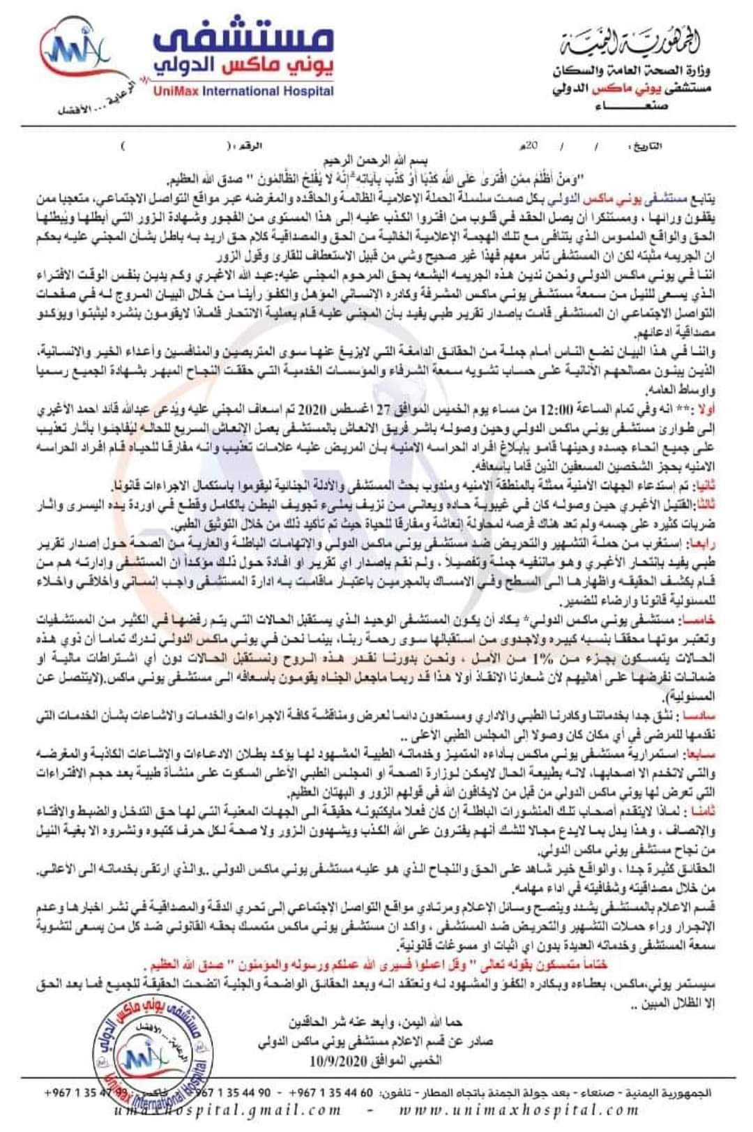 أصدرت إدارة مستشفى يوني ماكس الدولي في العاصمة صنعاء بيانا بشأن مقتل الشاب عبدالله الأغبري بطريقة وحشية.