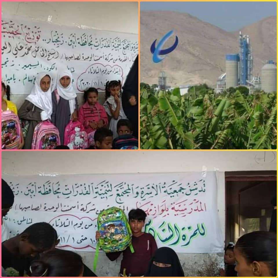 للعام السادس على التوالي وبدعم سخي ولفتة إنسانية من الأخ الشيخ محمد علي العيسائي رئيس مجلس إدارة شركة الوحدة للأسمنت والشكر موصول للشيخ محمد الوالي على إشرافه وجهوده وكذا الشكر لتنسيق قيادة مكتب التربية والتعليم في مديرية زنجبار ممثلة بالأخ الأستاذ نادر أحمد فضل مدير مكتب التربية والتعليم زنجبار ويأتي توزيع الحقيبة المدرسية ولوازمها للأطفال الأيتام ضمن جهود وأعمال جمعية الأسرة والمجتمع أبين وإدخال الفرحة والسرور على الأطفال الطلاب الأيتام من مناطق زنجبار والمسيمير والكود والشيخ سالم وعمودية وباجدار وضواحيها و بفضل من الله دشنا قبل أيام بمدرسة الميثاق بالكود توزيع 715 حقيبة مدرسية مع لوازمها للأيتام وأكرر شكري للشيخ العيسائي على لفتاته الإنسانية السنوية فيما يتعلق بالحقائب المدرسية والسلل الغذائية وكسوة العيد وهذا ليس بغريب على الشيخ محمد علي العيسائي وشركة الوحدة للأسمنت التي لها إسهامات مجتمعية وإنسانية وصحية وتعليمية وإجتماعية كثيرة ومتواصلة في أبين كما أشكر دور وجهود أعضاء الهيئة الإدارية لجمعية الأسرة والمجتمع أبين على ماتم بذله من جهود