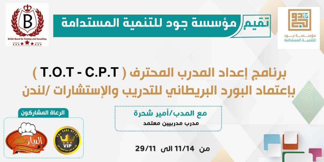 تواصل مؤسسة جود للتنمية المستدامة إقامة برنامج إعداد المدرب المحترف (T.O.T - C.P.T) بقاعة الثقافة في المركز الثقافي بمدينة عتق عاصمة محافظة شبوة لـ 35 متدرب ومتدربة مع المدرب الدولي أ. أمير يحيى شحرة (مدرب مدربين معتمد) وبـ إعتماد البورد البريطاني للتدريب والأستشارات/لندن .